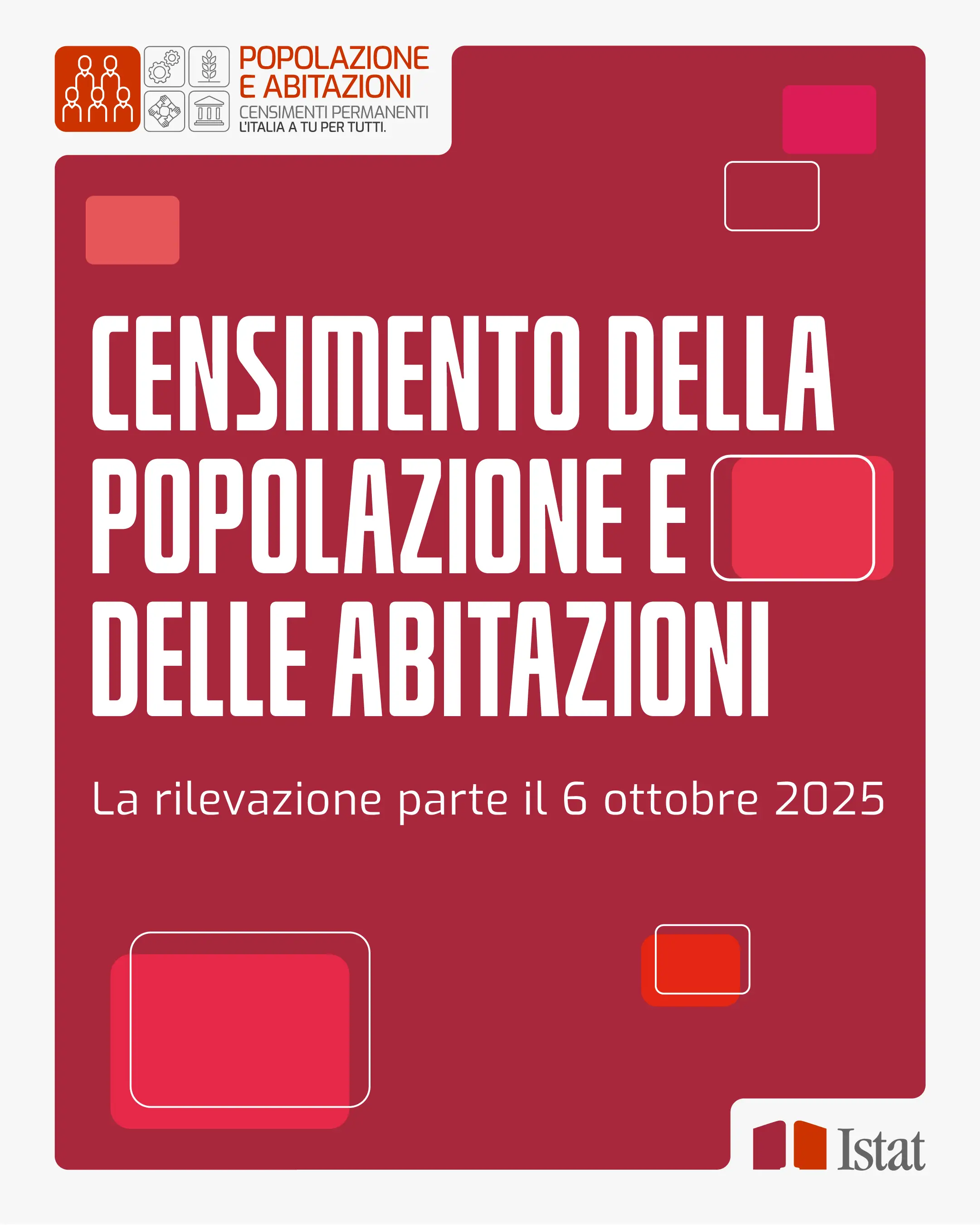 Dal 06 ottobre 2025 l'Istat - Istituto nazionale di statistica - darà il via a una nuova edizione del Censimento permanente della popolazione e delle abitazioni che coinvolgerà 2533 comuni e circa 1,5 milioni di famiglie e individui.