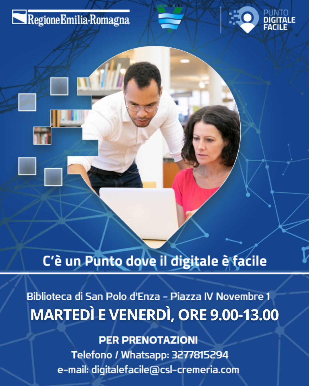 Hai bisogno di aiuto per usare il pc, le app, la mail, l'identità digitale, per prenotazioni con SPID o per l'utilizzo dei siti della pubblica amministrazione? Da giovedì 30 Maggio 2024, anche a San Polo d'Enza, parte il progetto Digitale Facile che offre gratuitamente un servizio di facilitazione digitale e aiuto nell'utilizzo dei dispositivi informatici.