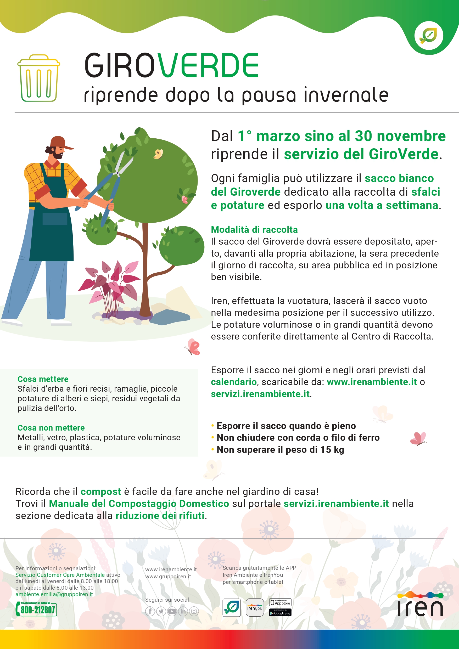 • nel sacco puoi mettere sfalci d'erba e fiori recisi, ramaglie, piccole potature di alberi e siepi e residui vegetali da pulizia dell'orto.