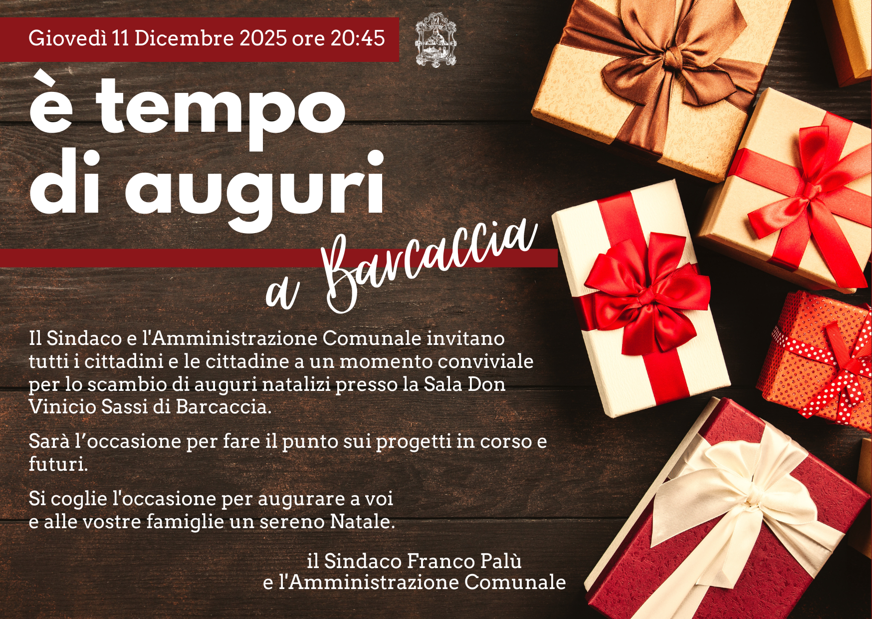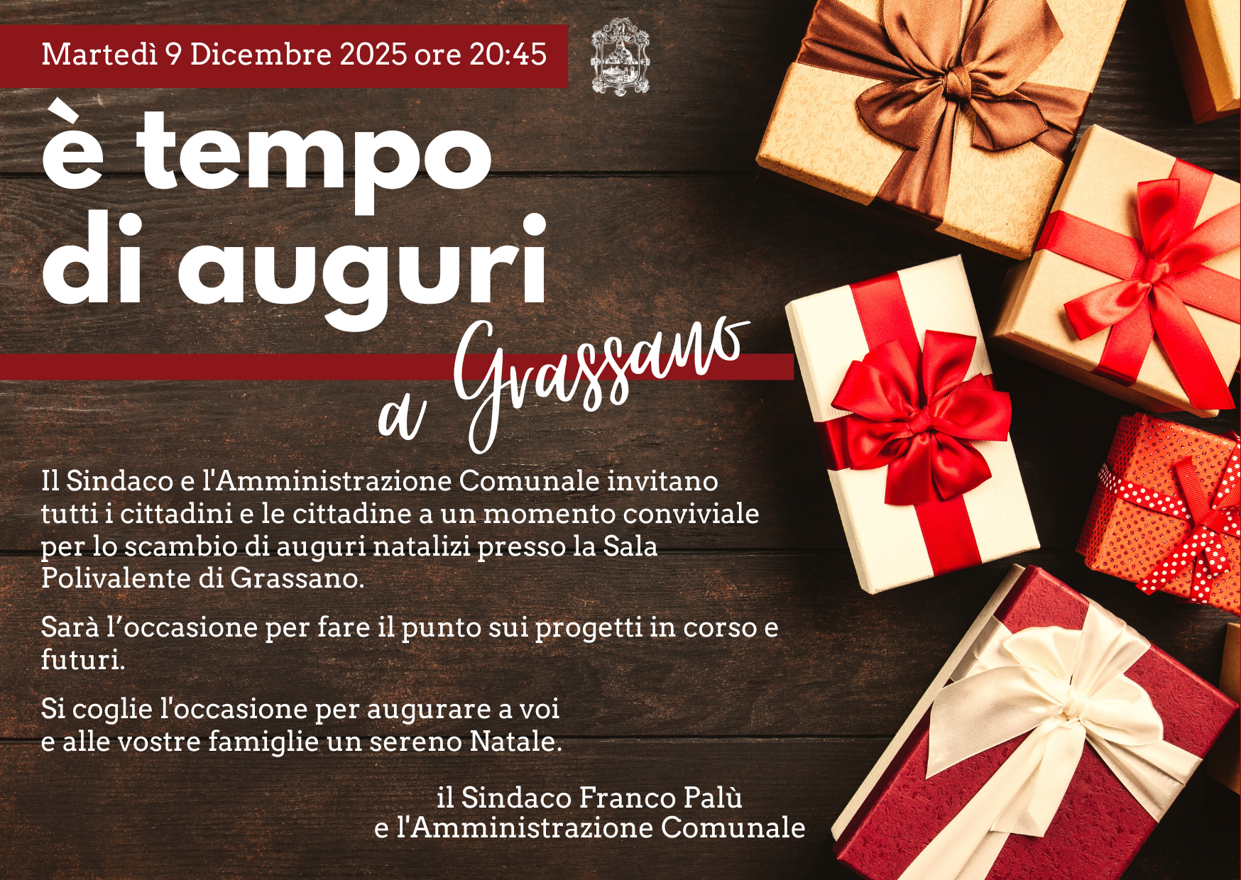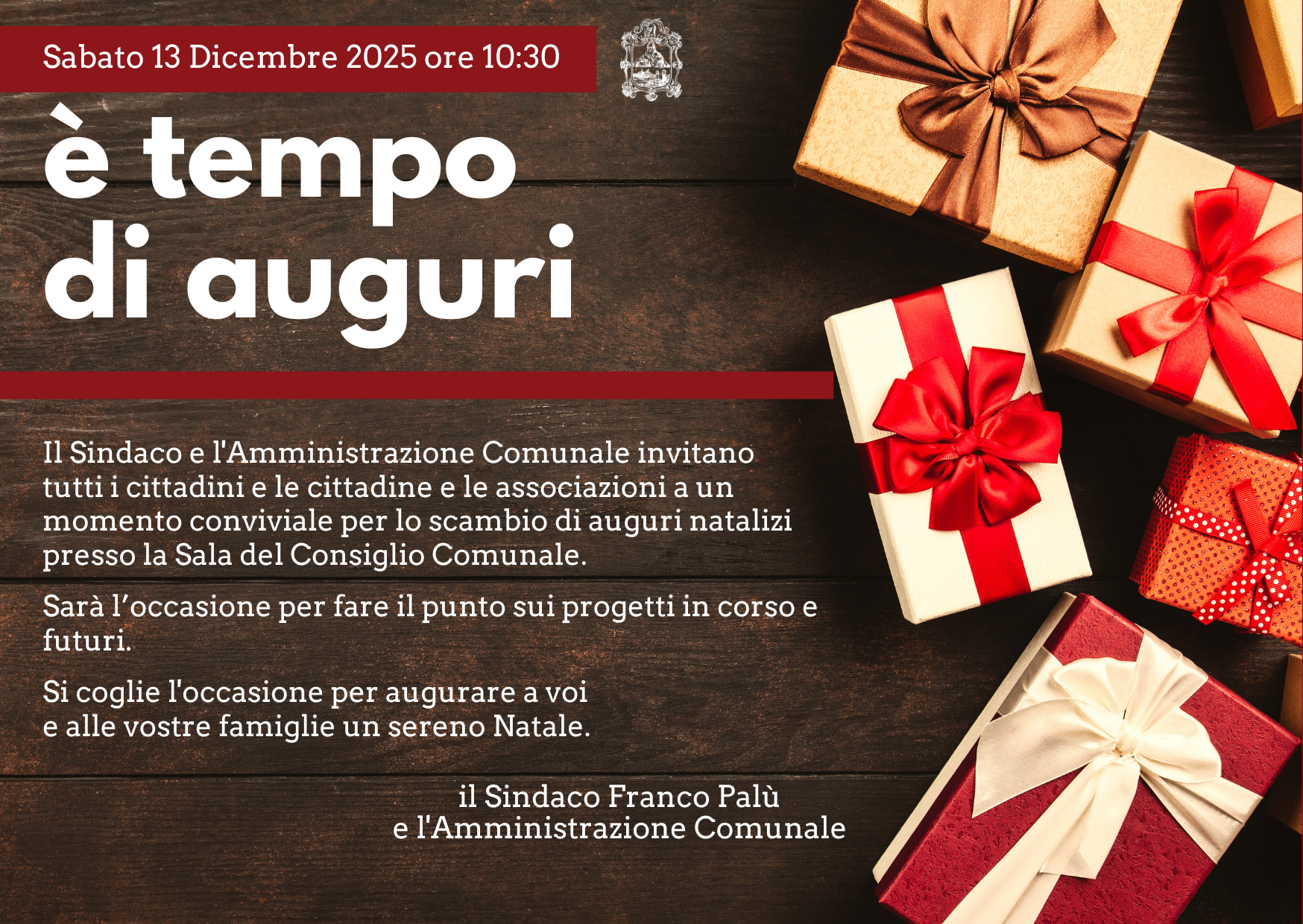 Il Sindaco Franco Palù e tutta l’Amministrazione comunale invitano i cittadini, le cittadine e tutte le Associazioni sampolesi a momenti conviviali per lo scambio di auguri natalizi.